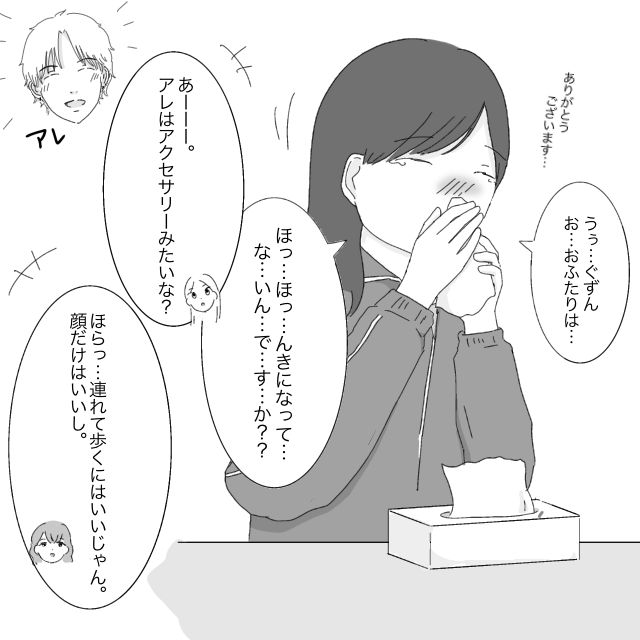 私は、差し出されたティッシュで鼻をかみながら、「おふたりは本気になってないんですか・・・?」と聞きました。すると2人は「あーアレはアクセサリーみたいな?」「ほら、連れて歩くにはいいじゃん、顔だけはいいし」と笑いながら言います。