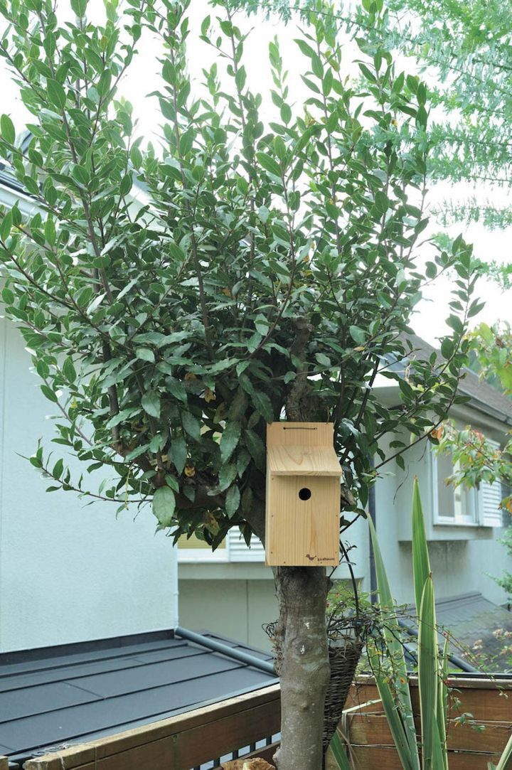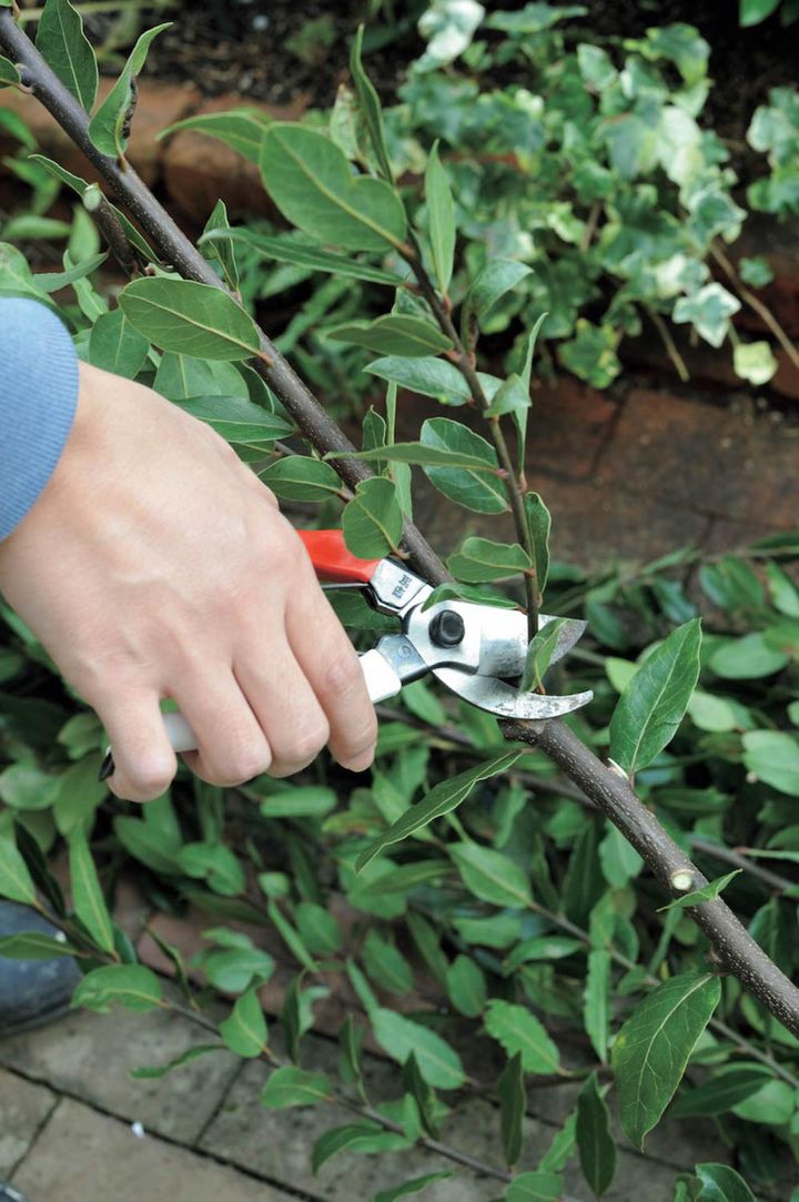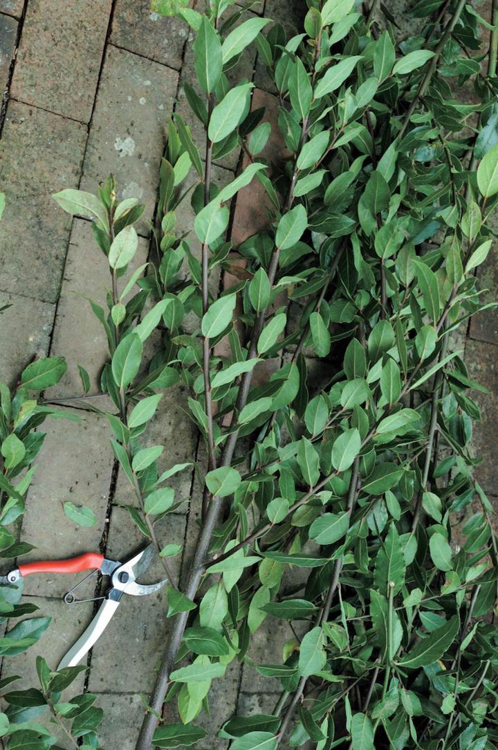 クリスマスのリース作りに合わせて強剪定するゲッケイジュ。長い枝は支柱に、小枝はリース作りに、葉は乾燥させて料理に活用。