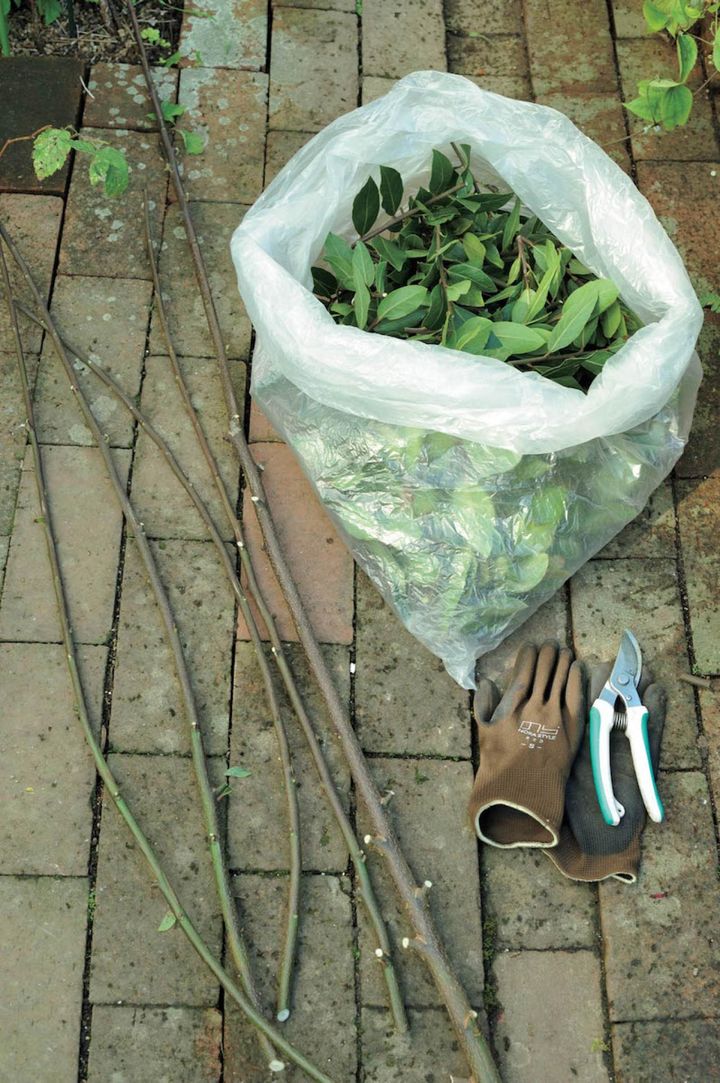 ④草花の支柱用に長い枝を残し、小枝や葉はビニール袋に取り分けておく。