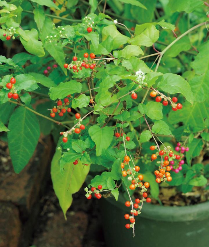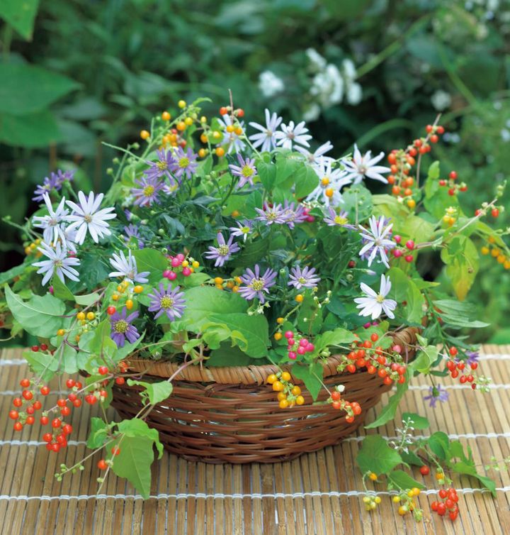 初夏~10月まで、花を咲かせながらかわいい実をつけるジュズサンゴ。寒さにあたると枯れてしまうので、整理がてら収穫してアレンジのベースを作り、隙間にアスターなどを差し込みました。小さな3色の実が秋の風情を漂わせます。