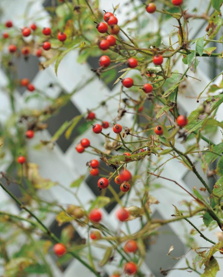 白いつるバラ ‘スノーグース’ のローズヒップ。花後、数本長い枝を残すと、秋に小さな赤い実がたくさんなる。