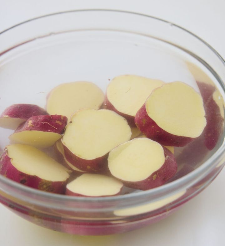 (1)さつまいもはよく洗い、皮つきのまま幅1.5cmの輪切りにして、たっぷりの水に10分ほどさらす。