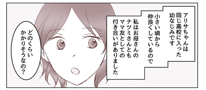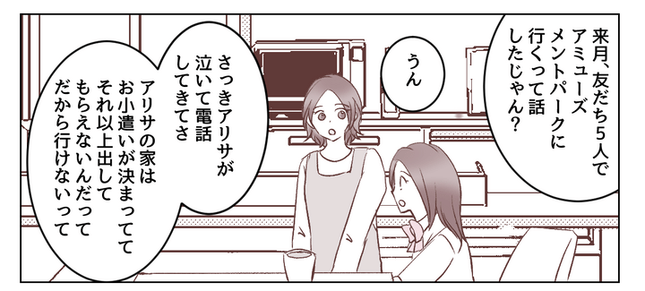 私はモモコ。娘のユウは高校1年生です。ユウには小さい頃から仲が良く、高校でも同じクラスになったアリサちゃんという友だちがいます。アリサちゃんのお母さんは倹約家で、ママ友ランチのお誘いにはあまり乗らなかったタイプ。ママ友たちで遊びに行く企画があったときも、お金がかかる場所は断ってきていた記憶があります。ユウは今度アリサちゃんも含めた5人グループで、アミューズメントパークへ遊びに行くという話だったのですが……?