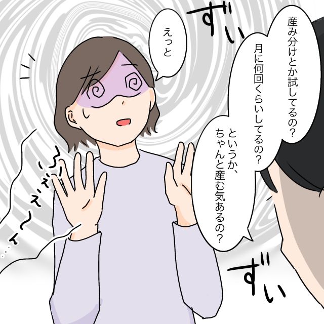 「産み分けとか試してるの?月に何回くらいしてるの?というか、ちゃんと産む気あるの?」と義母がどんどん踏み込んでプライベートなことまで根掘り葉掘り。「えっと」と答えつつクラクラしていました。