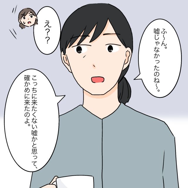 「ふ~ん。嘘じゃなかったのね~」と言い出す義母に、「え??」と驚く私。「こっちに来たくない嘘かと思って、確かめに来たのよ」平然とそう話す義母にドン引き。