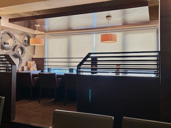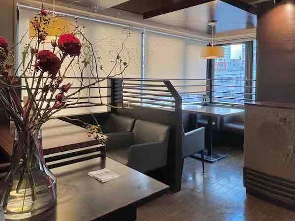 階段をのぼった先に見えるのは、深みのある茶色を基調とした広いカフェ空間!テーブルからカウンターまで30席ほどが並びます。どこに座ってもリラックスして過ごせそうです。