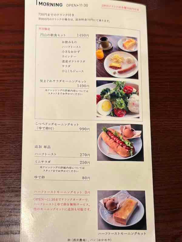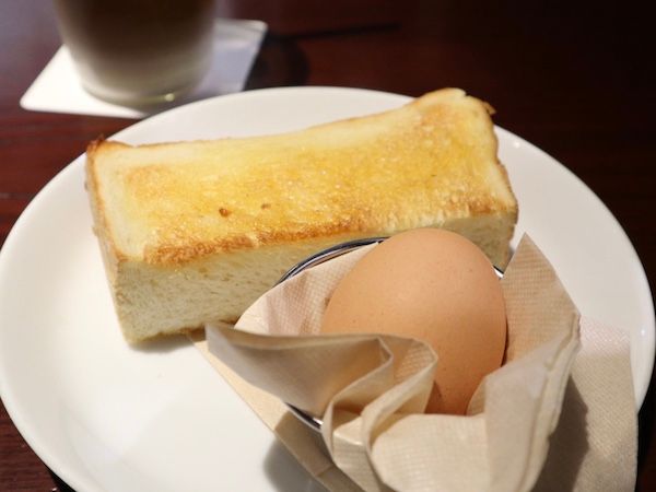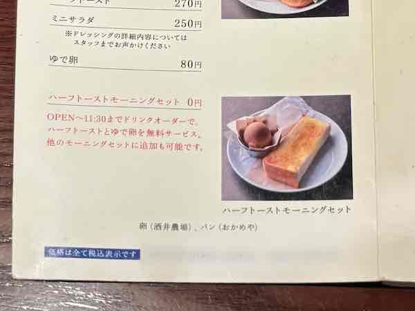 毎朝8時半から11時半まで、730円以下のお好きなドリンクの注文で、ハーフトースト&ゆで卵がセットの「ハーフトーストモーニングプレート」が無料でいただける、という驚きのサービスです。
