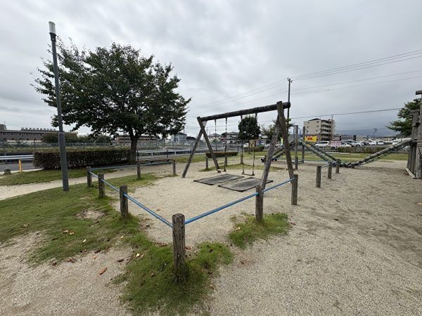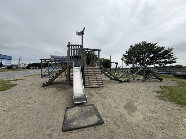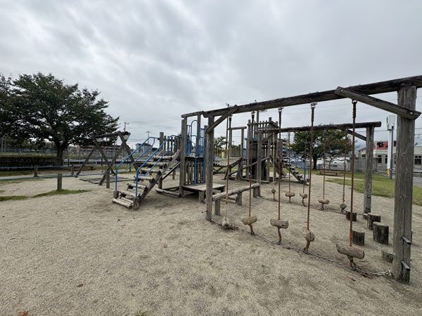 こちらの公園の遊具は木材で出来たアスレチック仕様です。目の前にするだけでワクワクしますね。高さはそれほどないので小さなお子様も親御さんと一緒に楽しめるのではないでしょうか。