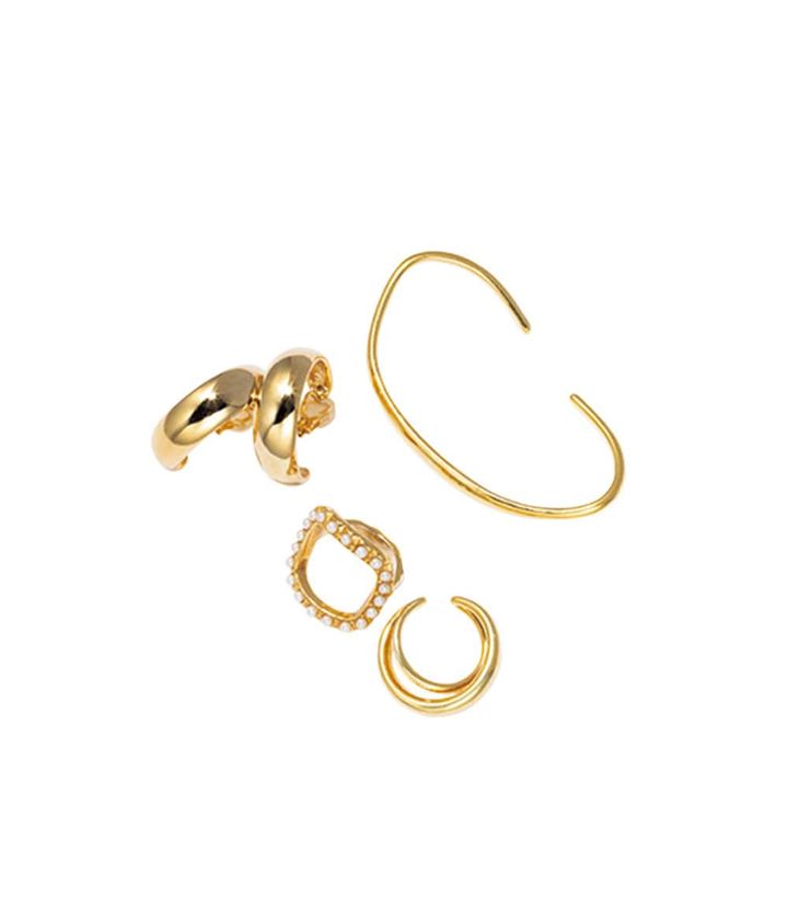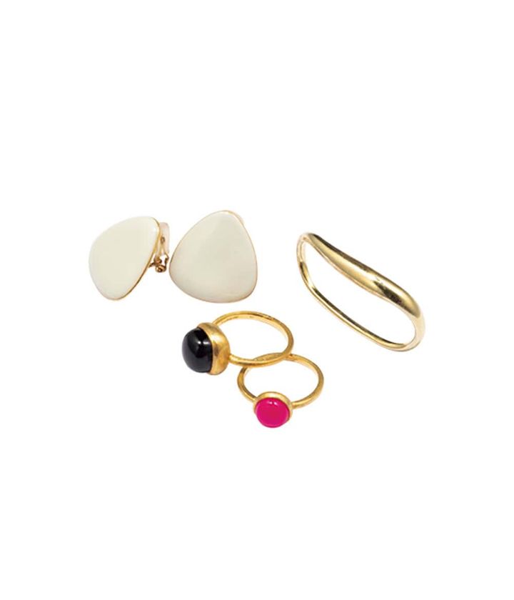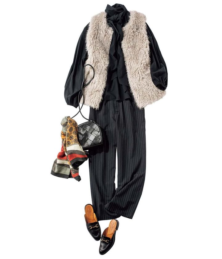 フェイクファージレ¥27,500 ボウタイブラウス¥25,300 パンツ¥20,900 ショルダーバッグ¥17,600〈すべてデミルクス ビームス〉バッグに巻いたストール¥16,500〈マニプリ〉ビットミュール¥35,200〈ジャランスリウァヤ別注〉バングル¥48,400 ゴールドリング¥31,900〈ともにアイソレーション> イヤリング¥11,000〈デミルクス ビームス〉 スクエアリング¥19,800〈グリン〉(すべてビームス ハウス 丸の内)