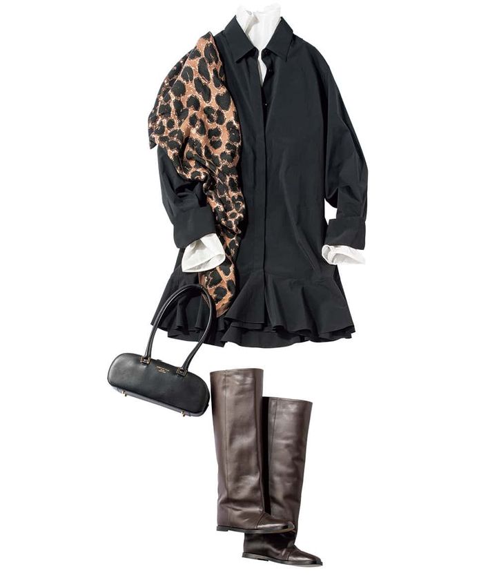 フリルヘムシャツ¥31,900 オフタートルブラウス¥23,100〈ともにデミルクス ビームス〉 レオパードストール¥16,500〈マニプリ〉ロングブーツ¥108,900〈BRENTELLA JULIE/EFFE BEAMS〉バッグ¥36,300〈クリスチャン ヴィラ〉ホワイトイヤリング¥9,900〈デミルクスビームス〉 カーブリング¥29,700〈アイソレーション〉オニキスリング¥18,700 ピンクリング¥16,500〈ともにフリュイジョリ〉(すべてビームス ハウス 丸の内)