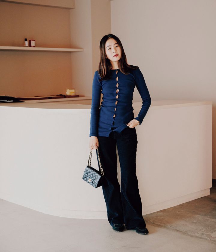 SHISHIKUI×HARUTAのコラボローファー、SHISHIKUIの〈holed top〉トップス、〈MIC〉パンツ、ストラップブラ、リング、CHANELのバッグ、Cartierの時計は全て本人私物