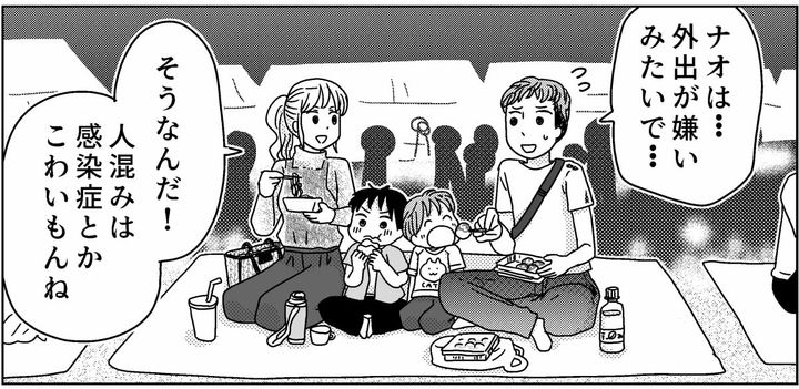 ジンの誕生日には、家族みんなでアミューズメントパークへ行って楽しませてあげたい。俺はそう思って、いつも以上に熱心にナオをお出かけに誘ったのです。なんとかナオはアミューズメントパークへ一緒に来たものの、終始一人行動。1日ベンチに座って読書をしていました。一緒に列に並ぶこともしなければ、一緒にパレードを見ることもしない。場所とりをするわけでもない。楽しみにしていた花火を見る前にナオが帰ると言い出したのです。正直ジンと2人で行った方が楽しかったと後悔しました。