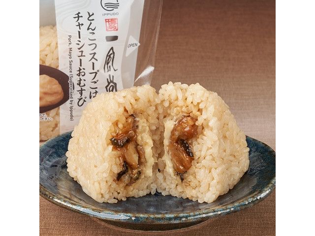 「博多一風堂」監修のおむすびです。とんこつスープと一緒に炊いたごはんで、甘辛ダレと絡めたチャーシューと、マヨソースを包んだおむすびです。