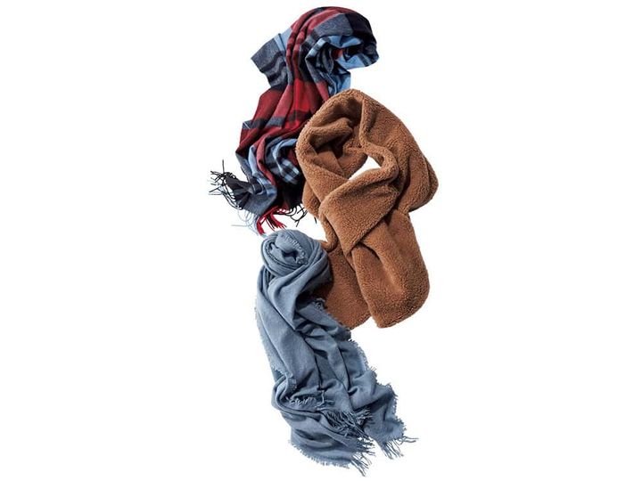 〈上から〉チェックストール¥93,500(ジョシュアエリス/真下商事)ボアショール¥39,600(スロー/オデット エ オディール 新宿店)ブルーストール¥44,000(アソース メレ/アイネックス)
