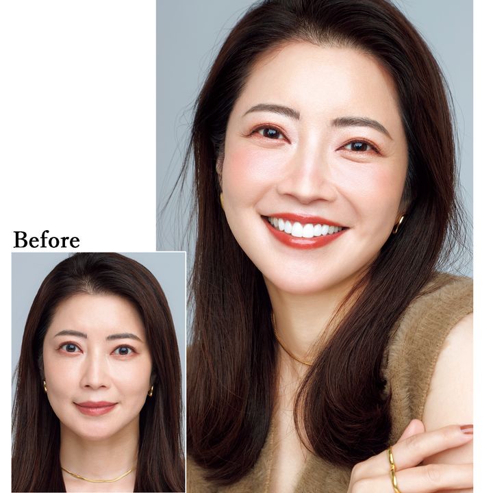 顔に凹凸や血色がないと、Beforeのようにのっぺりたるんで見えて、どこか疲れた感じに。逆に血色感と影を施すと、Afterのようにはつらつとした印象になるだけではなく、キュッと引き締まった小顔も叶います。