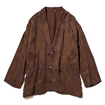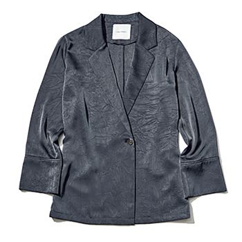 チャコールグレージャケット/LAGUNAMOON(LAGUNAMOON ルミネ新宿) 「このジャケットはイージーケアかつ、サテンでもレディに転びすぎないのもうれしい。軽くなめらかな素材感で着心地の良さもお気に入り」(出口さん)