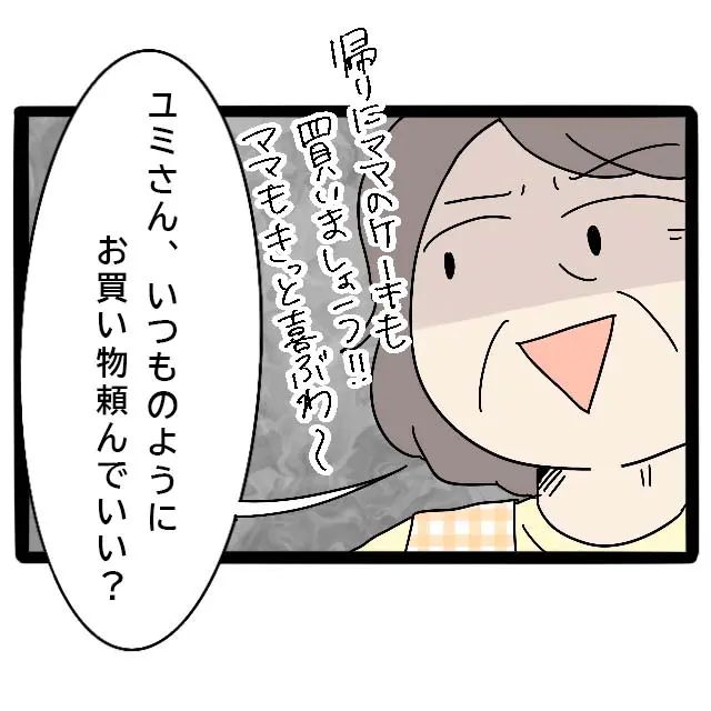 すると義母は私に「ユミさん、いつものようにお買い物頼んでいい?」と意地悪そうな顔で言いました。ダイには「帰りにママのケーキも買いましょう!きっと喜ぶわ~」と建前を話しますが、私だけを仲間外れにしたいのが見え見えです。
