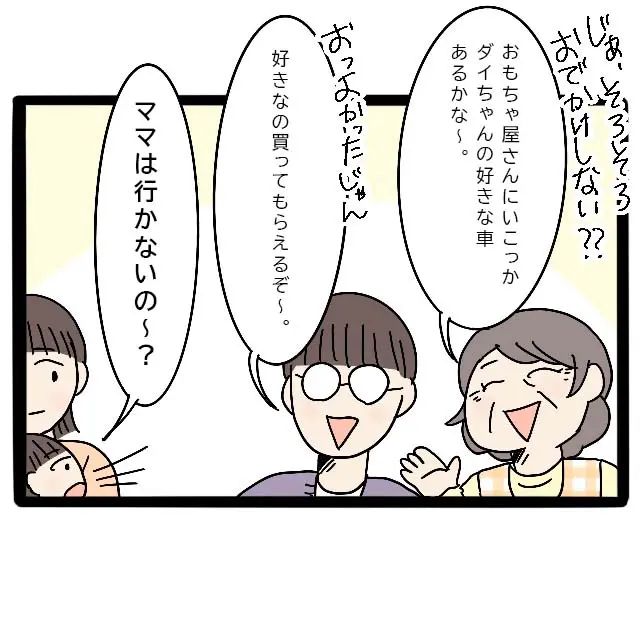 お寿司を食べ終わると、義母は夫と息子をお出かけに誘います。「おもちゃ屋さんに行こっか、ダイちゃんの好きな車あるかな~」「よかったじゃん、好きなの買ってもらえるぞ」とノリノリな2人。するとダイが「ママは行かないの~?」と聞きます。