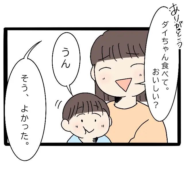 義実家にいる間は、ダイだけが私の癒しです。「ありがとう、ママはいいからダイちゃん食べて」と言うと、ダイは大好物のおいなりさんをおいしそうに食べます。「おいしい?」と聞くと「うん」と私に笑顔を向けてくれました。