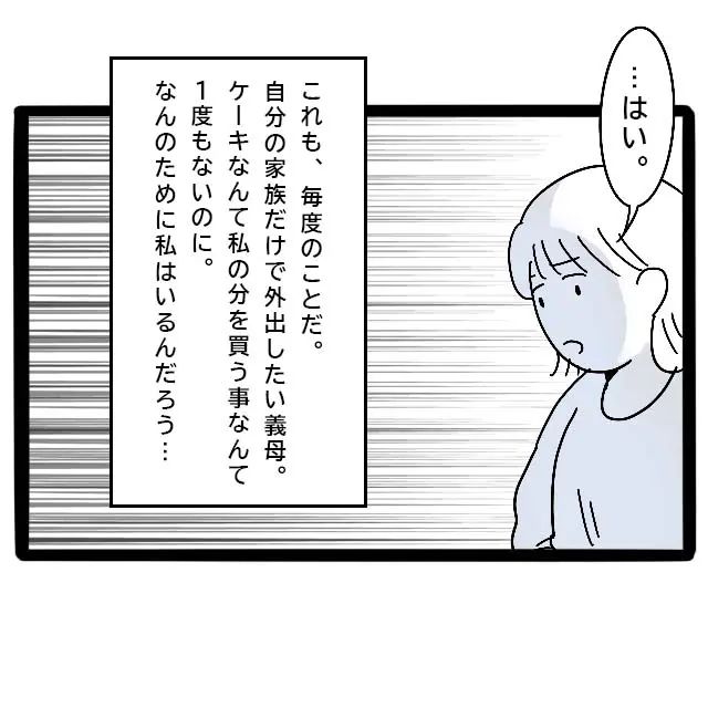 これも義実家に来ると毎回のことです。自分の家族だけでお出かけしたい義母は、いつも私を使い走りにします。私の分のケーキを買ってきてくれたことなんて一度もないのに・・・何のために私はここにいるんだろうと考えてしまいます。