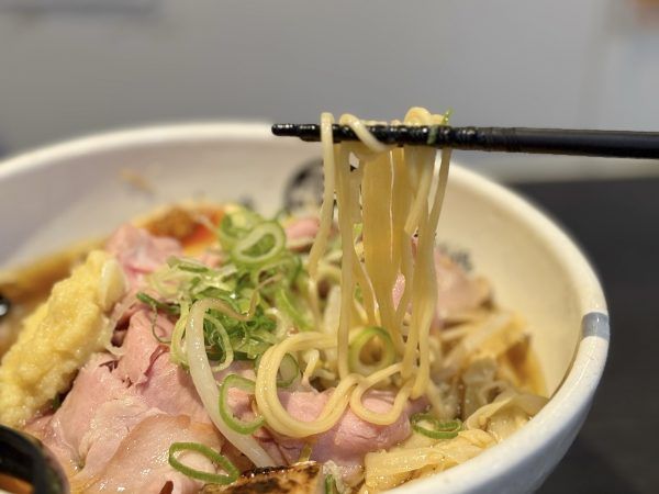 もう一つは、「肉そば」とは真逆の極太麺、濃い味の「まぜそば」にしてみました。「まぜそば」のスープは醤油と旨辛の2種類で、こちらはタレも濃いめでパンチがあります。(写真は醤油)
