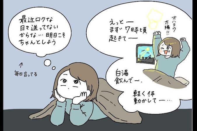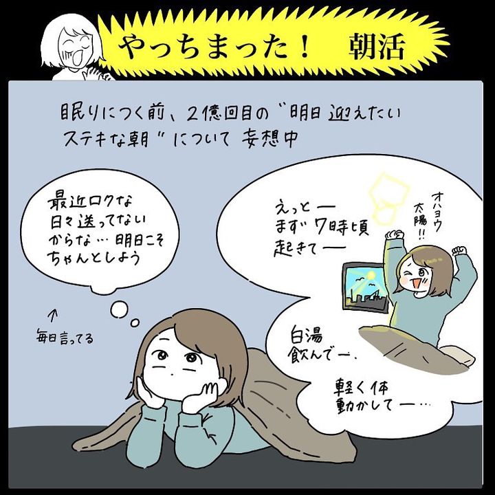 こんにちは!Instagramで日々の暮らしを漫画で紹介している、Web漫画家のmomoです。自堕落の権化のようなわたしですが、生まれ変わって「朝活」を始めることにしたんです!早朝に目覚めて、ゆったり読書して、おいしい朝食を食べれば、充実した1日になるはず♪朝にやりたいあれこれを想像して眠りについた結果、なにが起こったのか!?みなさんのご想像通りかもしれませんがね…(泣)。