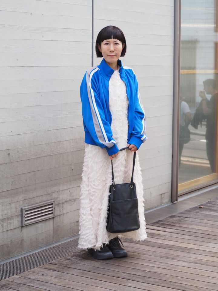 「人と被らないことを意識してコーディネートを組んでいます。テイストが違うものをミックスするのが好きです」。この日はドレッシーなワンピースに今季注目のトラックジャケットを重ねてこなれ感を演出。存在感のあるフリンジワンピースがとても華やかで、ジャージとのギャップが◎。