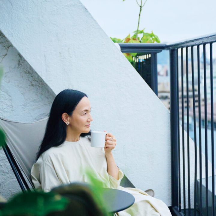 朝のひと時、ゆったりベランダでコーヒーを飲む時間は至福の時。「『ご自愛』って自分に言ってあげていいと思うんです。