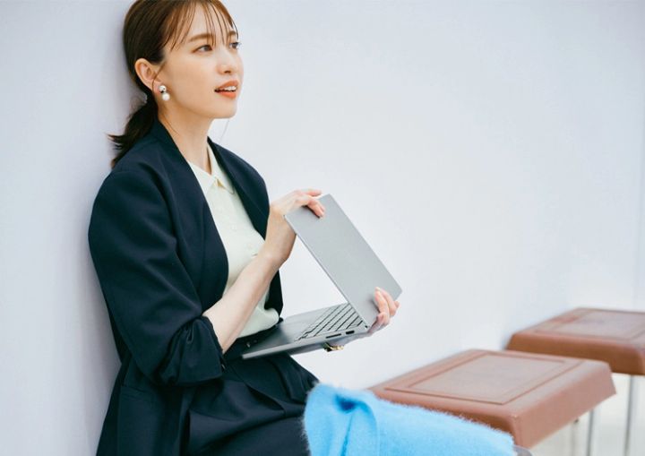 寒いミーティングルームではストールをブランケット代わりにして、しっかり防寒。ネイビースーツとブルーのセットは清潔感が出るから、お仕事向き。ストールは暗く見えがちな冬服を明るくする効果も。