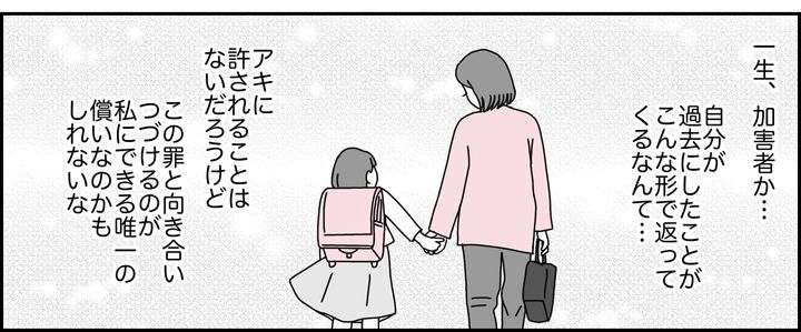アキに謝罪の手紙を破られ、「一生、加害者」と呼ばれて、私は初めて過去に自分がしたことがどれだけアキを傷つけていたのかに気づけました。入学式の日から私が感じていた不安など、アキの心の傷に比べれば取るに足らないものだったのでしょう。