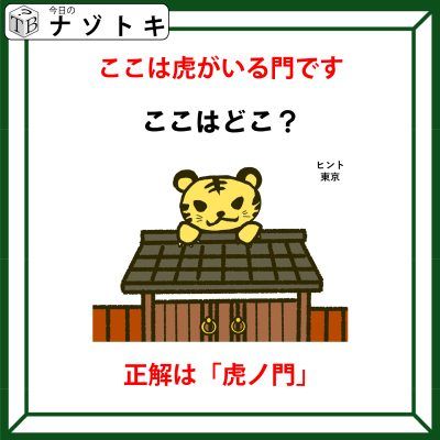 つまり、このイラストは虎がいる門ということです。ここまでいえばわかりますね。そうです!「虎ノ門」です!テレビ局があったりするとても大きな町です。正解は「虎ノ門」でした。