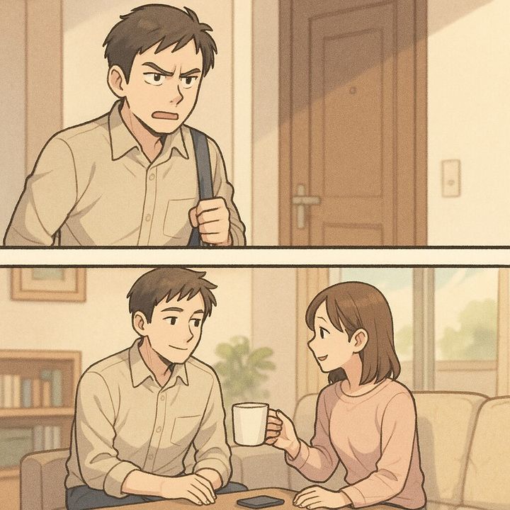 いつものようにイライラしながら帰ってきた夫が、リビングのソファに深く座り込みました。