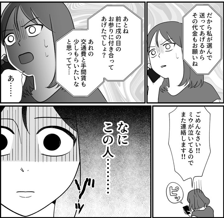 「あとね、前に戌の日のお参りに付き合ってあげたでしょう? あれの交通費と手間賃も少しもらいたいなと思って」と加えて言われ、ミウが泣いてるからと電話を切ったのでした。呆れた……ミウの様子を聞きたいのかと思ったら、お金のことばっかり。しかも、「買ってやるからお金を出せ」「付き添ってやったんだから交通費と手間賃を出せ」って……信じられません!