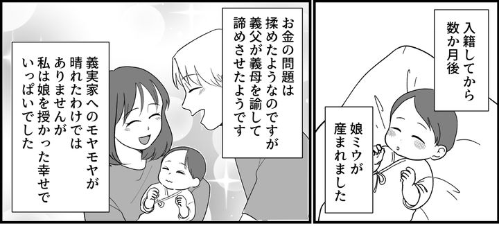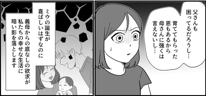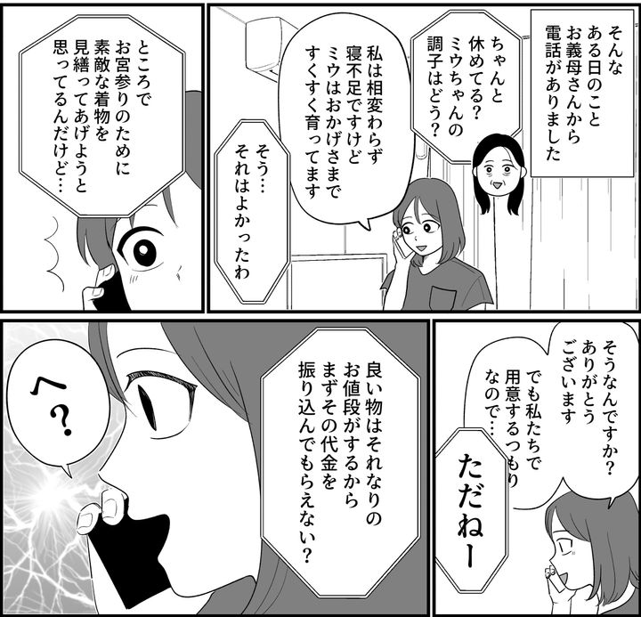 そして、無事にミウが産まれて幸せいっぱいの私たち。そんなある日「お宮参りのお着物を購入するお金を振り込んでほしいの。あと離乳食の食器も考え始めないとね」と、義母から電話がありました。私は言葉を失いました。