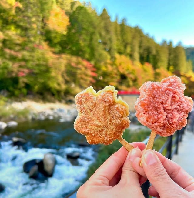 最大の見どころは夜のライトアップ。黄金色に輝く木々が川面に映る「逆さもみじ」は、息をのむほど幻想的な美しさです。近くの店舗で買える「もみじ饅頭衣揚げ」を片手に、紅葉狩りを楽しみましょう♪