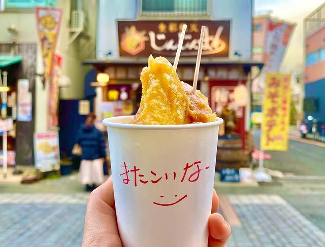 「食彩秩父 じんじんばあ」では、揚げたてアツアツを手軽に味わえるのが魅力。カップに書かれた「またこいなー」という秩父弁のメッセージにも心が温まります。