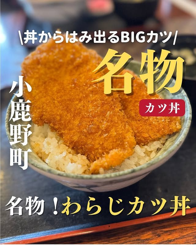 埼玉・小鹿野に行ったら「わらじカツ丼」は外せません! 精肉店直営ならではの柔らかい肉質が特徴です。丼から豪快にはみ出す巨大なカツは、見た目のボリュームとは裏腹に、意外にもペロリと完食できてしまいますよ。