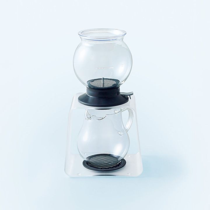 〈HARIO〉のスタンド付きの「ティードリッパー ラルゴ スタンドセット」。「上のドリッパーで茶葉を抽出したあと、連結部分のスイッチを押し、氷をセットしたピッチャーへ注ぎ込めば、簡単にアイスティーが完成。茶葉をジャンピングさせて味をしっかり出すためにドリッパーが丸い形になっていたり、グラスに注ぐときに氷まで流れ落ちないようにピッチャーの注ぎ口の形状が工夫されていたりと、繊細なガラスの成形技術はさすが。台座まで透明で美しく、茶葉の色が見えるので、抽出のタイミングを計りやすいのもいいですね。見た目もフラスコみたいで、抽出を待っている時間も楽しい」