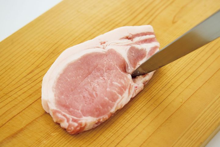 豚肉は脂身と赤身の境目に数カ所、包丁の刃先を深く刺して筋を切ることで、焼いたときにそり返りにくくなります。