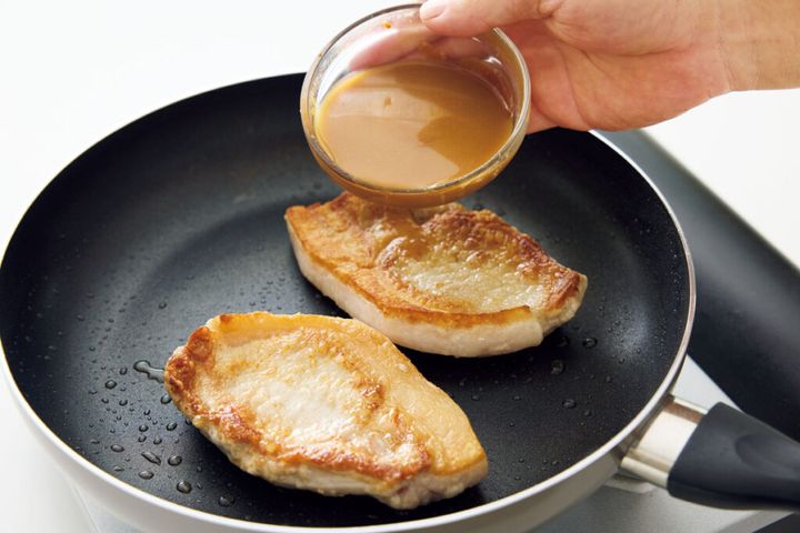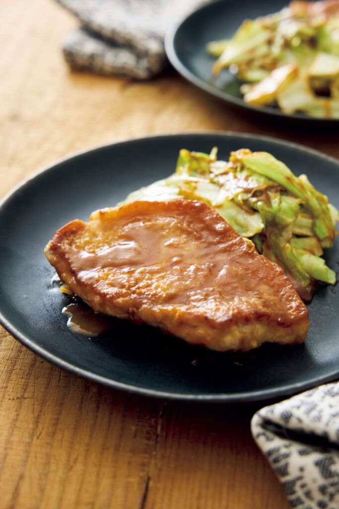 (2)フライパンにサラダ油を中火で熱し、豚肉を盛りつけたときに上になる面を下にして並べ入れる。そのまま3分焼いて上下を返し、余分な脂を拭いて(1)のみそだれを加える。全体にからめ、かるくとろみがついたら豚肉を器に盛る。同じフライパンにキャベツを入れてみそだれを全体にからめ、ふたをして中火で1分ほど蒸し焼きにし、豚肉に添える。