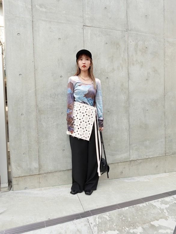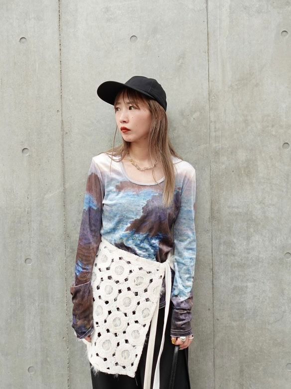 「アート柄がお気に入りのベロアトップスは、トレンド感も演出できてお気に入り。タイトなシルエットなので、ひとクセあるフロッキーレースのエプロンを腰に巻いてカバーしました。ウエストマークすることで腰の位置も高く見える気がします!」(MARTE/saharaブランドマネージャー、SYKIA デザイナー三好香織さん)