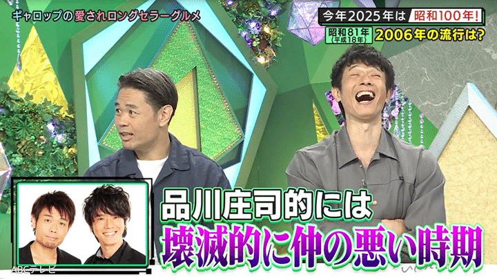 出演者たちが昔のブームや思い出を懐かしむ中で、品川庄司は19年前の2006年を回顧。当時について2人は、「(ラストイヤーで出場した)M-1の次の年だから(2006年は結成)11年目ですね」「品川庄司的には壊滅的に仲の悪い時期」と語り、スタジオ一同を笑わせた。