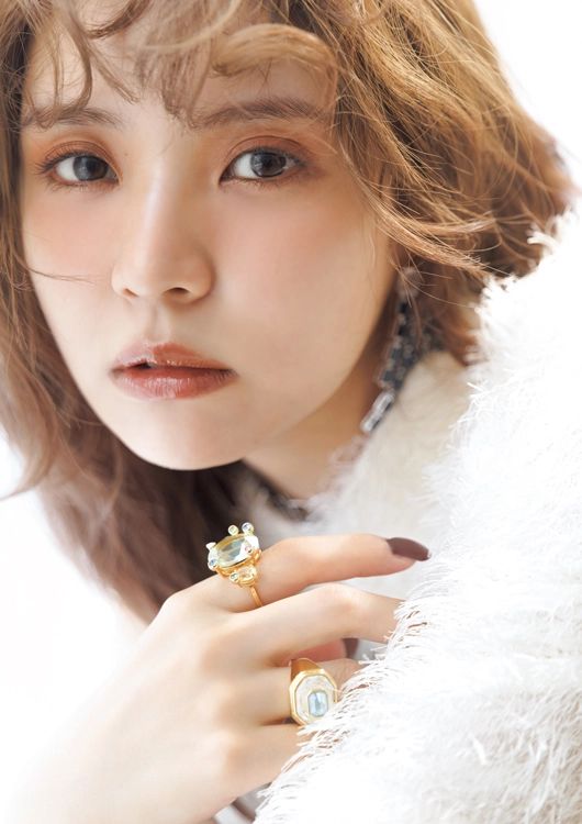 白シャギーシャツ¥19,800/アニュアンス イヤリング¥59,400、リング[人さし指]¥22,000、リング[薬指]¥28,600/ともにスワロフスキー・ジャパン(スワロフスキー・ジュエリー)