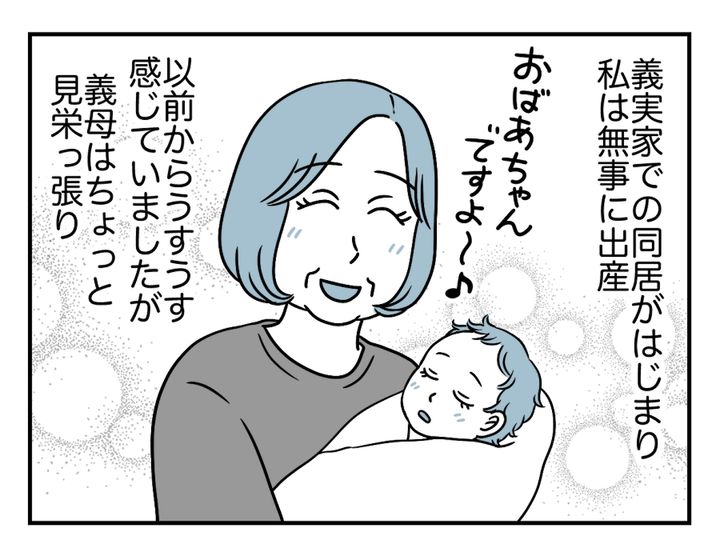 カリンさんは現在、初めての育児に奮闘中。夫のセイジさんが転職したばかりで収入が不安定のため、しばらく義実家で同居することになりました。義実家の建物は二世帯仕様。ある程度プライベートも確保できるため、同居生活のスタートは順調でした。