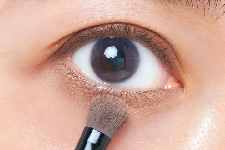 b.をブラシに取り、下まぶた全体に、ブラシ幅の太さで塗ります。涙袋全体に陰影をつけるイメージ。目だけでなく、中顔面も短く見えます。