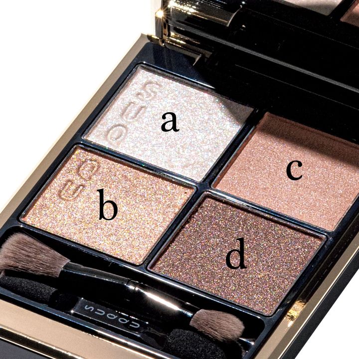 細いチップにa.を取り、黒目の下から目頭まで塗ります。目元が明るくなり、透明感と抜け感がアップ。全体に塗られた陰影がより際立ちます。