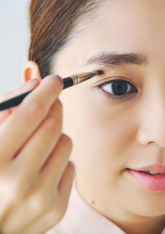 どこまで塗りたいのか、筆を置いて範囲を決め、その場所から目のキワに向かってシャドウをのせる。マットタイプは肌になじむのでいつもより広めに塗って。
