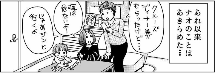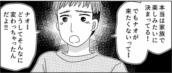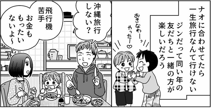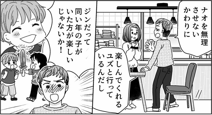 俺はナオが行きたがらなかった花火大会に、幼馴染のユズを誘いました。そこでもらったアドバイス通り、俺なりにナオに寄り添おうと思って考えたジンとのカレー作り。少しは家事の助けにもなるかもと思いました。けれどナオにとっては「余計なこと」だったようです。そして俺は、家族3人で思い出を作ることをすっかりあきらめてしまったのです。俺たち家族、キャンプや旅行なんてもう何年行っていないのか。ジンが生まれてからは一度も行っていないので、ジンはまだ旅行というものを経験したことがありません。