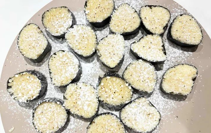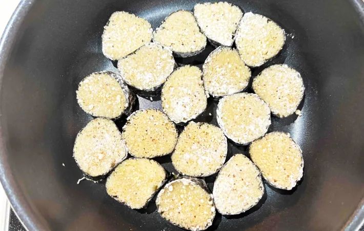 焼き海苔で巻いたエノキを、1cm程度の厚さに切ります。