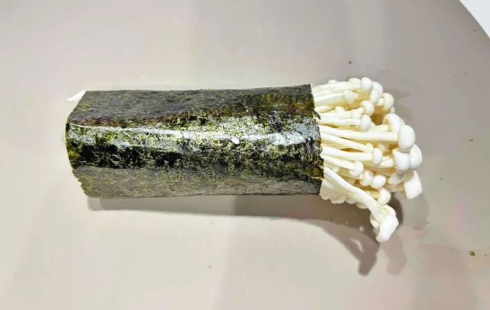 軽く水にくぐらせたエノキを、焼き海苔でくるくると巻き、端に水をつけて留めます。